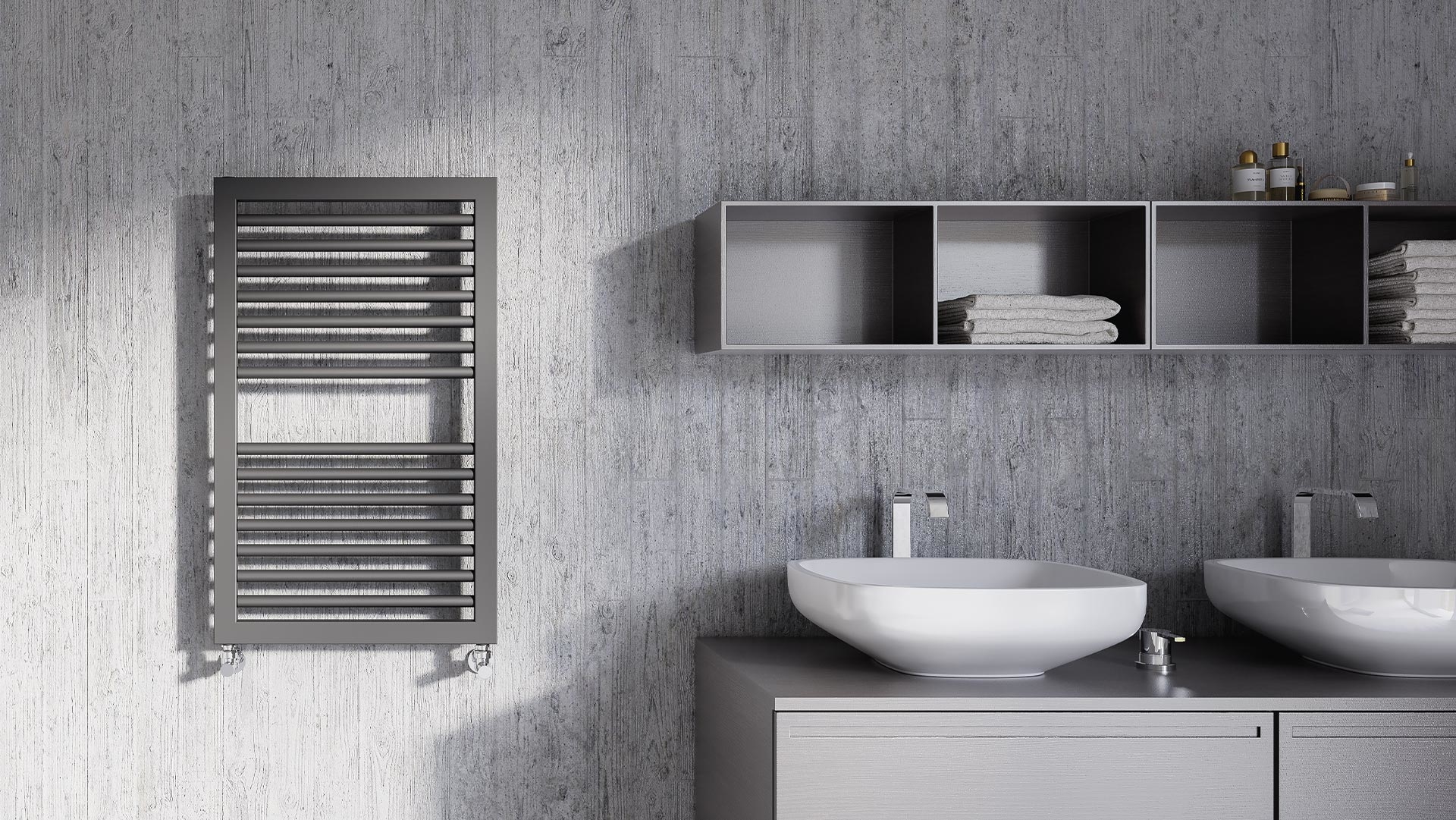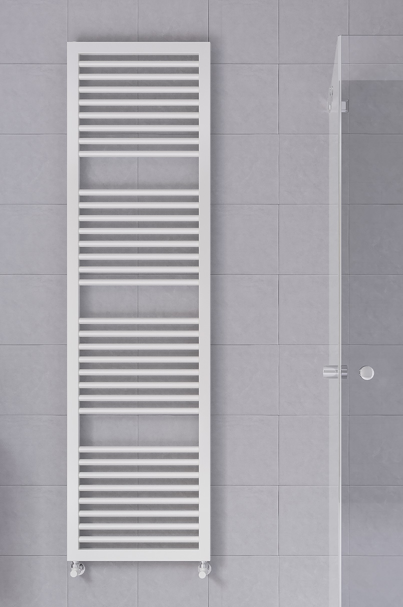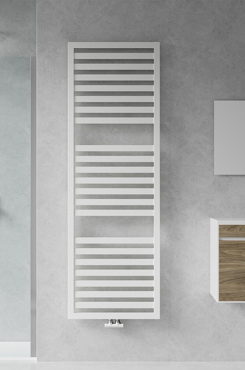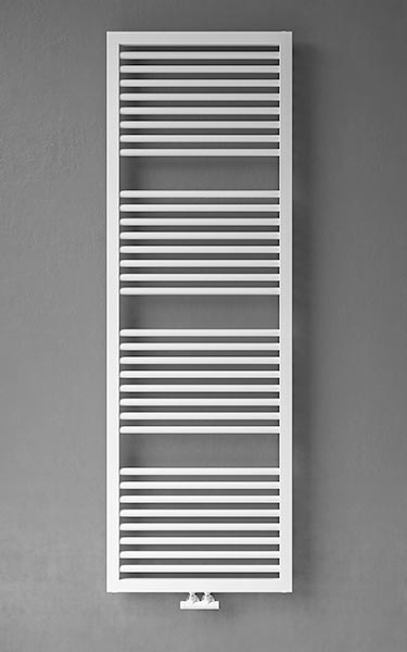Scaldasalviette da bagno in acciaio con collettori laterali rettangolari 40x30 mm e tubo tondo orizzontale dal diametro di 22 mm saldobrasato. Mensole nascoste.