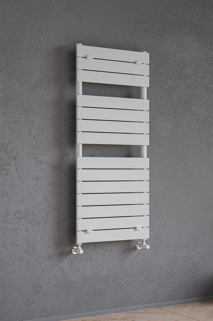 Scaldasalviette da bagno in acciaio con collettori laterali tondi dal diametro di 35 mm e tubo piatto dritto orizzontale 70x11 mm saldobrasato. Quattro mensole rettangolari.