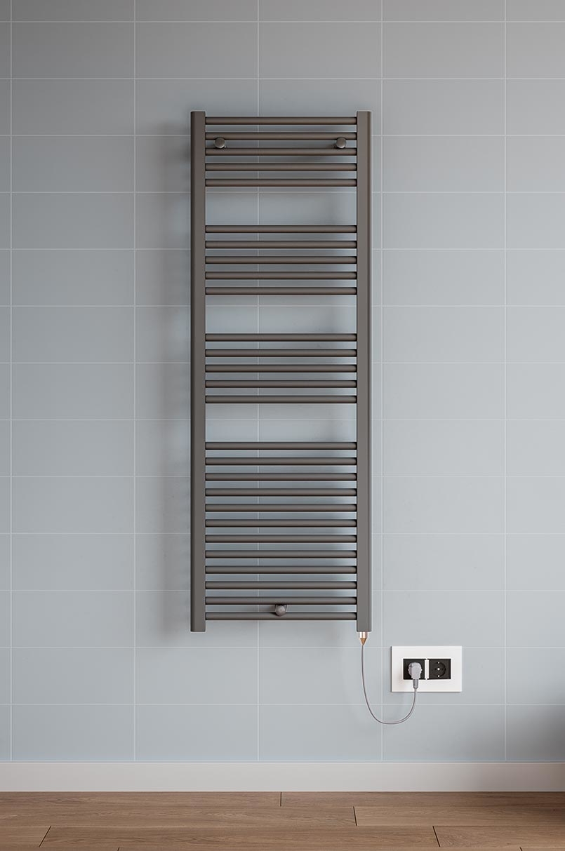 Scaldasalviette elettrico da bagno in acciaio con collettori laterali a forma di “D” 40x30 mm e tubo dritto tondo orizzontale dal diametro di 22 mm saldobrasato. Tre mensole tonde.